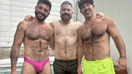 After hot tub blow jobs, spit roasting and making out in the private backyard, Ian Holms, Kano and Kev Inspiring take the party inside. Part 2 picks up in side where the three of them flip fuck and finish all over each other.